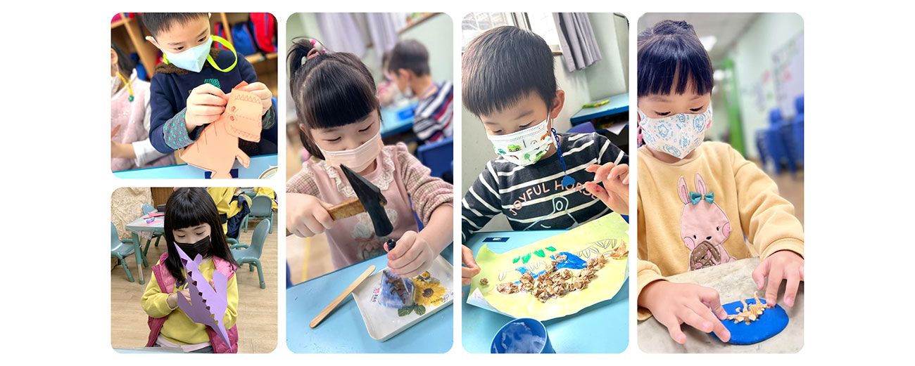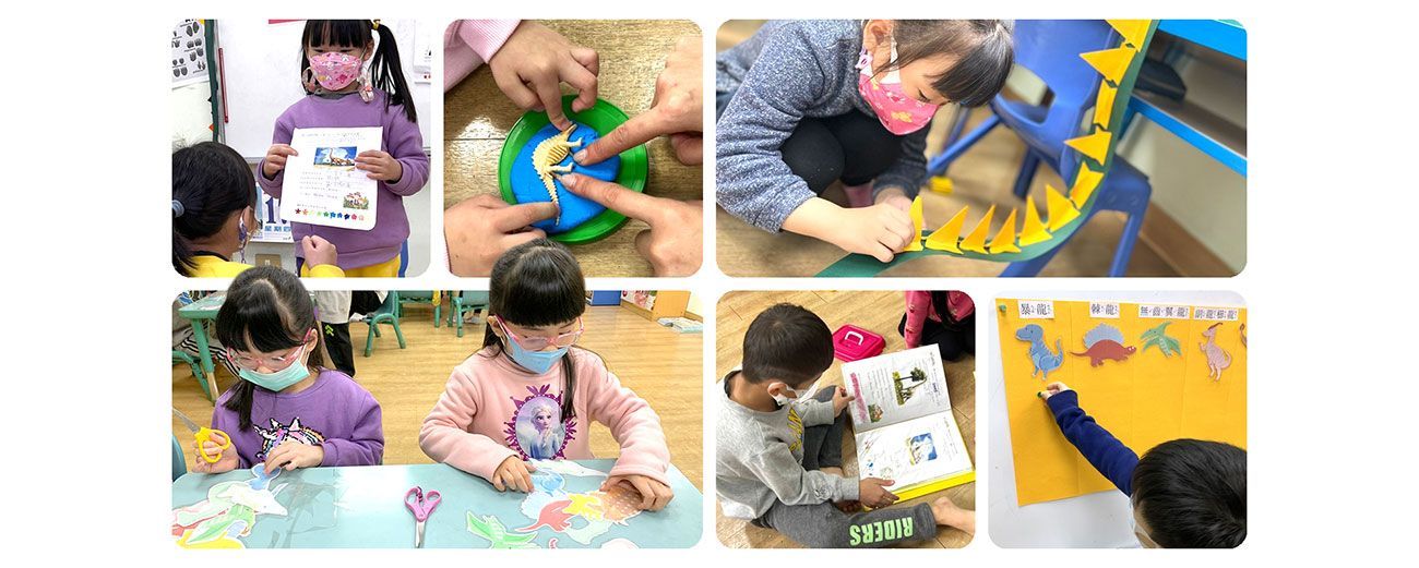 我們從認識恐龍的名字、習性及身體各個部位開始,小朋友們開始自發性地提出想要製作恐龍頭套、爪子、腳掌、皮膚(披風)...等想法,老師們則提供了相對應的資源,如:圖片、書籍、影片、紙材…滿足孩子的需要,過程中可以觀察到能力佳的孩子,能夠獨立並快速地完成工作,並會主動問老師說:「可以去幫忙同學嗎?」我覺得很棒,這也是一種合作、協助同儕的機會,透過相互交流,他們能夠體認到自己與別人的需要,並在給予的過程中被需要並得到自信增強、對技巧的運用更為熟練,能力相對提升,而被幫助的孩子,則能感受到需求被接納及滿足,班級中歸屬感提升、技巧能力的學習,最終會成長由被幫助者轉換腳色成為助人之人。看到孩子的逐漸成熟的互動模式,正向的情感交流與延續,真誠地感到欣慰。