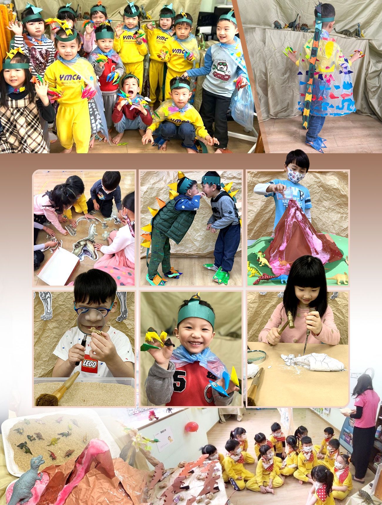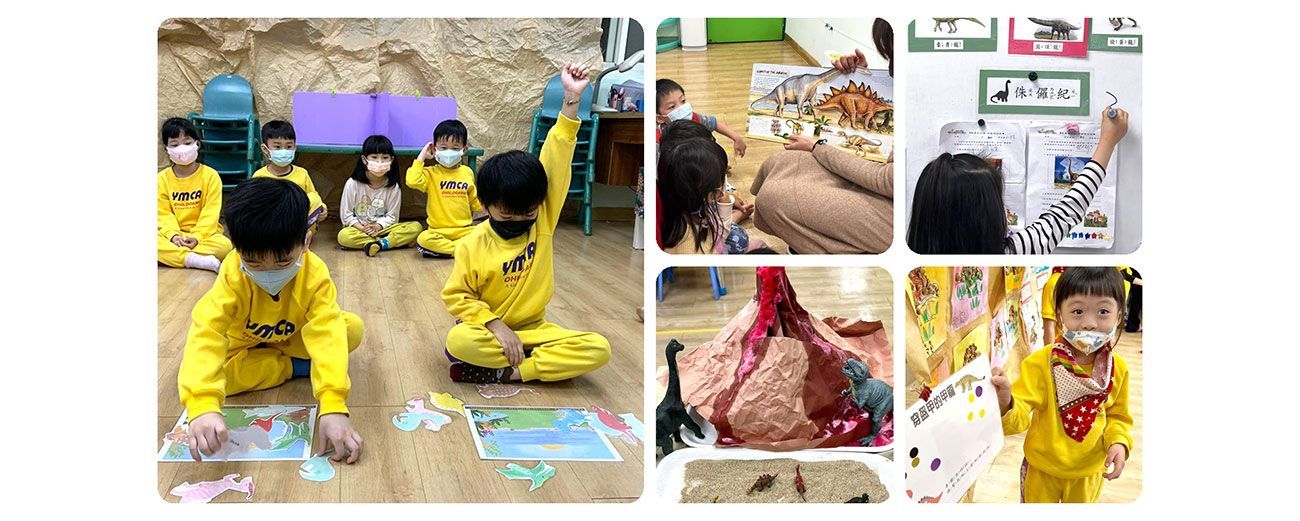 本學期是孩子在園內的最後一學期,本來是想安排一系列的大主題回顧幼兒園生活加幼小銜接課程,但孩子對我從家中帶來的恐龍模型一直很有興趣,所以決定利用前面幾週帶孩子進行與恐龍相關的課程,畢竟是在YMCA最後的時光,做些小朋友喜歡的活動,開開心心的渡過也是難忘的回憶!活動前我們預先發下通知單,請家長協助準備相關的物品,孩子們紛紛帶來自己的寶貝恐龍開心的和同學分享,並將恐龍們擺放在教室各處,超級熱鬧!