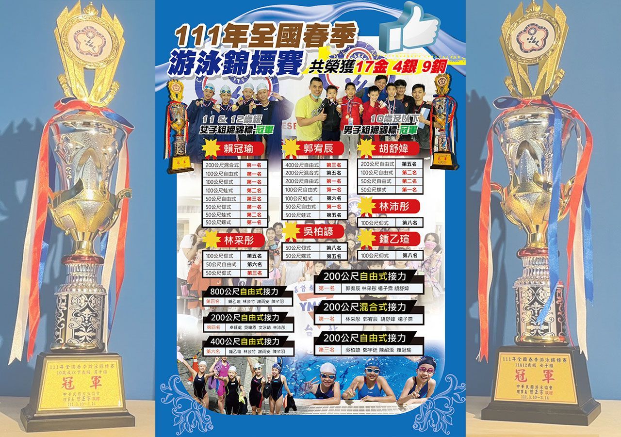 中華民國游泳協會於2022年3月10日至14日舉行『111年全國春季游泳錦標賽』,比賽地點在臺中市北區國民運動中心游泳池,參賽年齡層設定10歲以下至18歲以上,比賽項目包含自由式、仰式、蛙式、蝶式、混合式與接力賽,吸引逾1,200人參加。台北YMCA永吉會館、萬華會館、唭哩岸會館及泰山國民運動中心組成台北YMCA聯隊共同參與此場賽事,在這五天的賽事中,發揮最大的拚勁,最終取得總獎牌數17金 4銀 9銅,並取得了「男子10歲級」及「女子11-12歲級」的總冠軍。