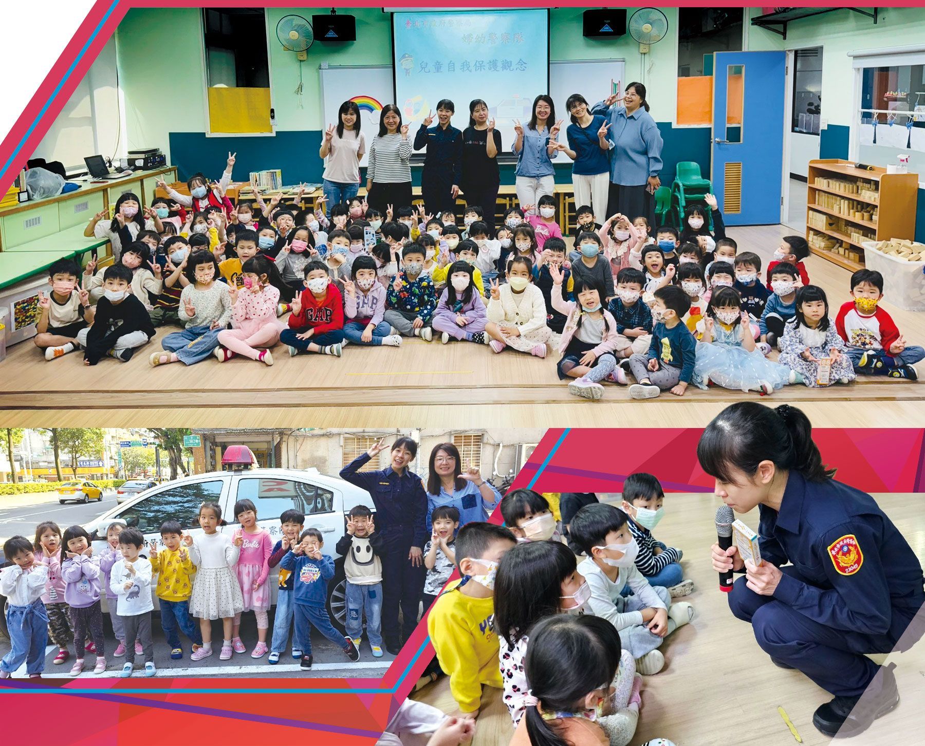 本會幼兒園永吉會館邀請臺北婦幼女警隊進行兒童安全教育課程,教導孩子們遇到陌生人怎麼辦?還有如何保護自己的身體。透過女警姐姐生動有趣的介紹,孩子們都很有收穫,最後大家還跟警車合影喔!