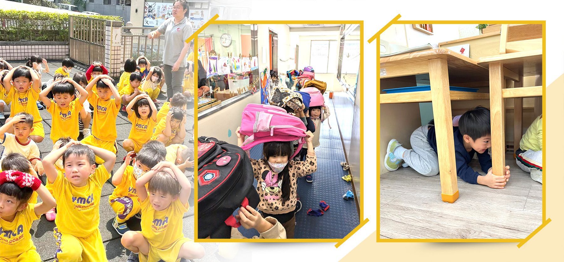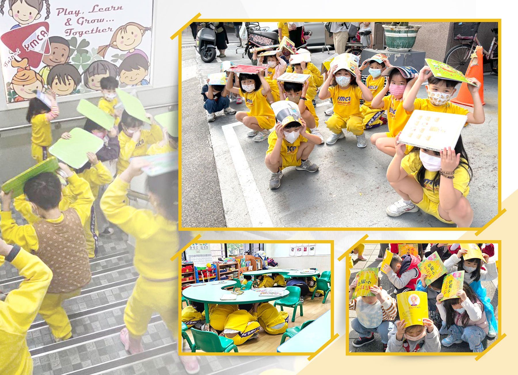 台北YMCA幼兒園於每一學期都會安排安全教育主題之「複合式防災演練」進行安全宣導,再透過模擬地震火警等緊急情況發生,來引導幼兒懂得地震或火警來時正確的避難及疏散方法,讓幼童熟悉演練流程及師長如何引導的應變作為,加強師生地震災害應變處理能力,使大家都能培養生活中警覺意識。
