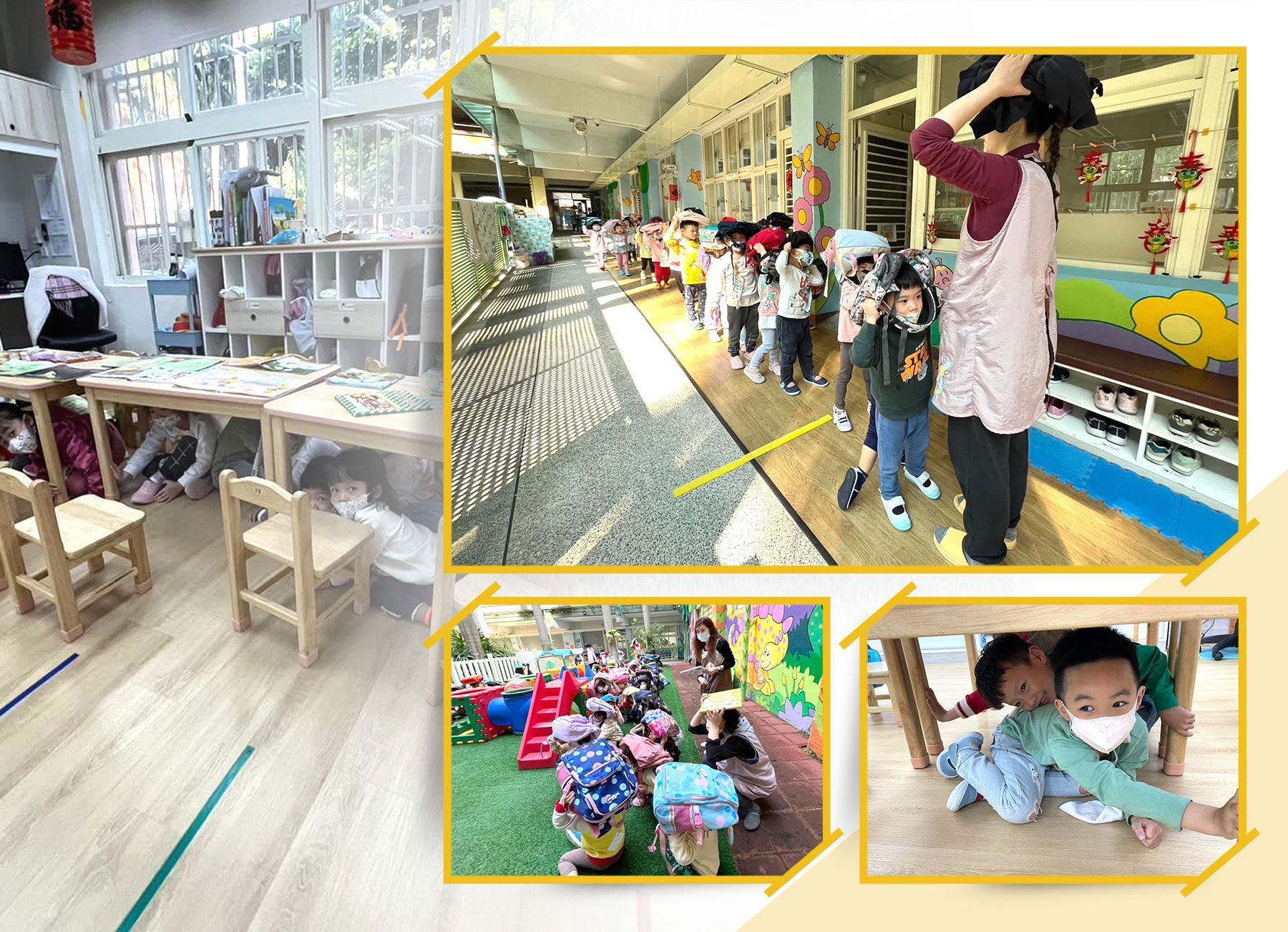 本會板新及文山兒童中心、永吉會館、雙中與民生非營利幼兒園分別於2月至 3月期間進行了安全教育之「複合式防災演練」,包含幼兒地震模擬逃生演練、火災逃生演練與幼童車逃生演練,透過模擬演練引導幼兒懂得地震或火警來時正確的避難與疏散方法,以培養生活中警覺意識。