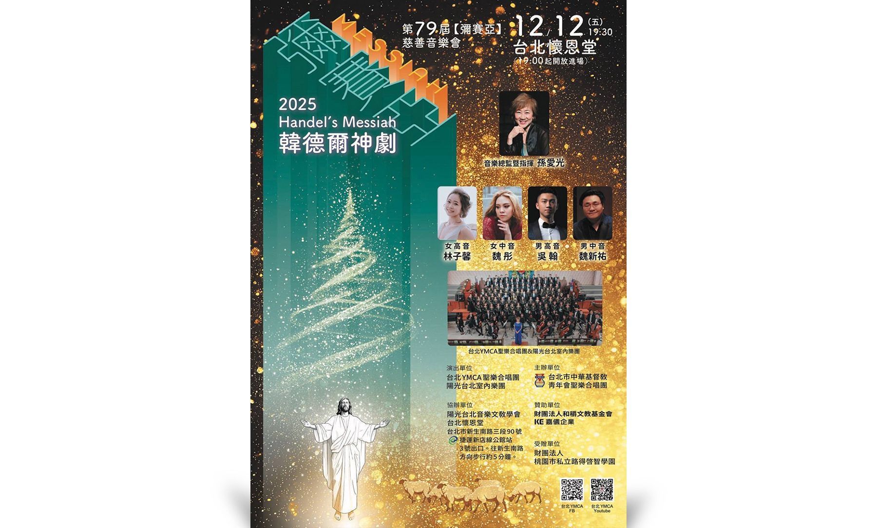 第79屆彌賽亞慈善音樂會於12月12日晚上7:30在台北懷恩堂舉行,由孫愛光音樂總監指揮,女高音林子馨、女中音魏彤、男高音吳翰、男中音魏新祐;台北YMCA聖樂合唱團、陽光台北室內樂團共同演出。有超過千名的基督徒聚集在一起,讚美上帝的救贖和奇異的恩典。並為「財團法人桃園市私立路得啟智學園」奉獻。
